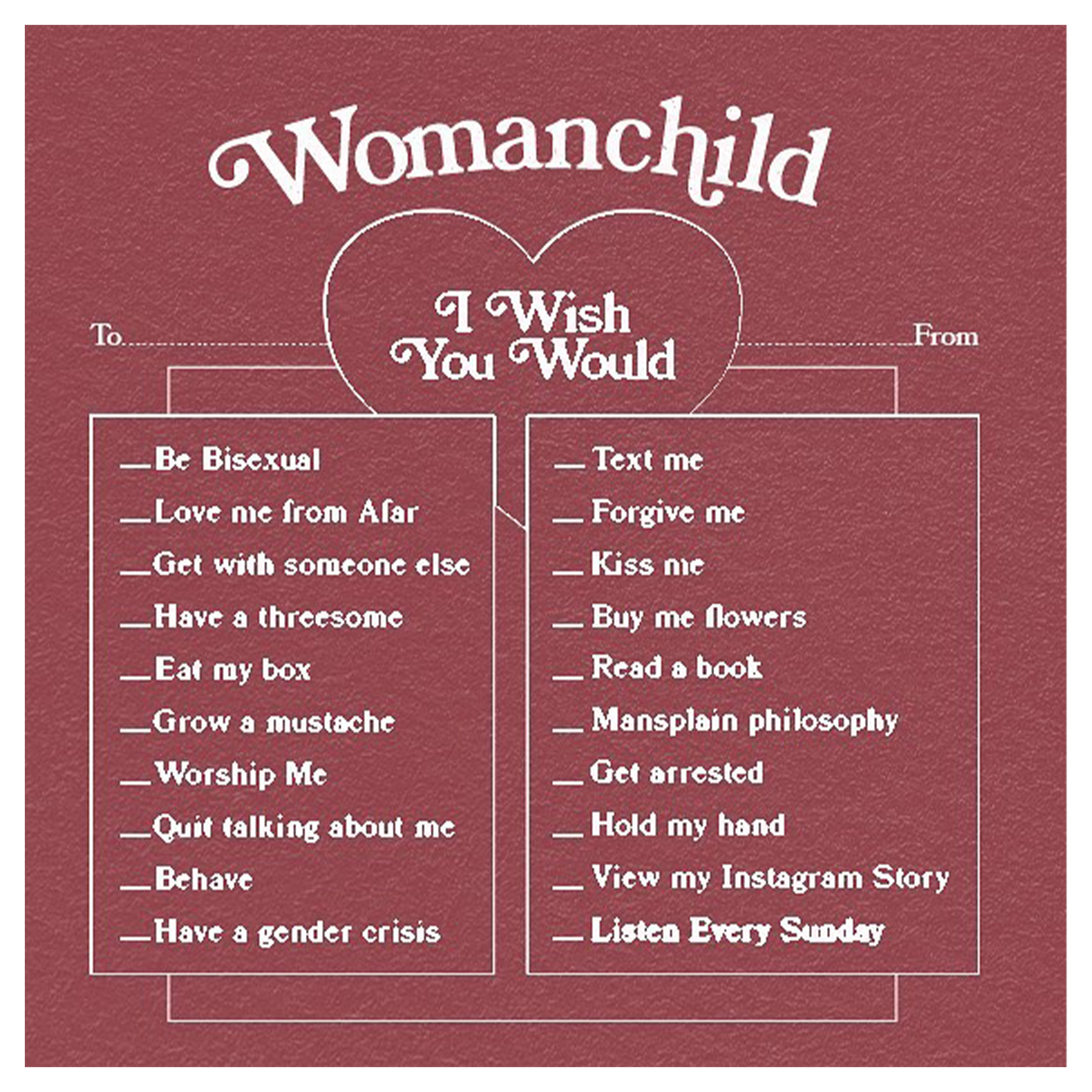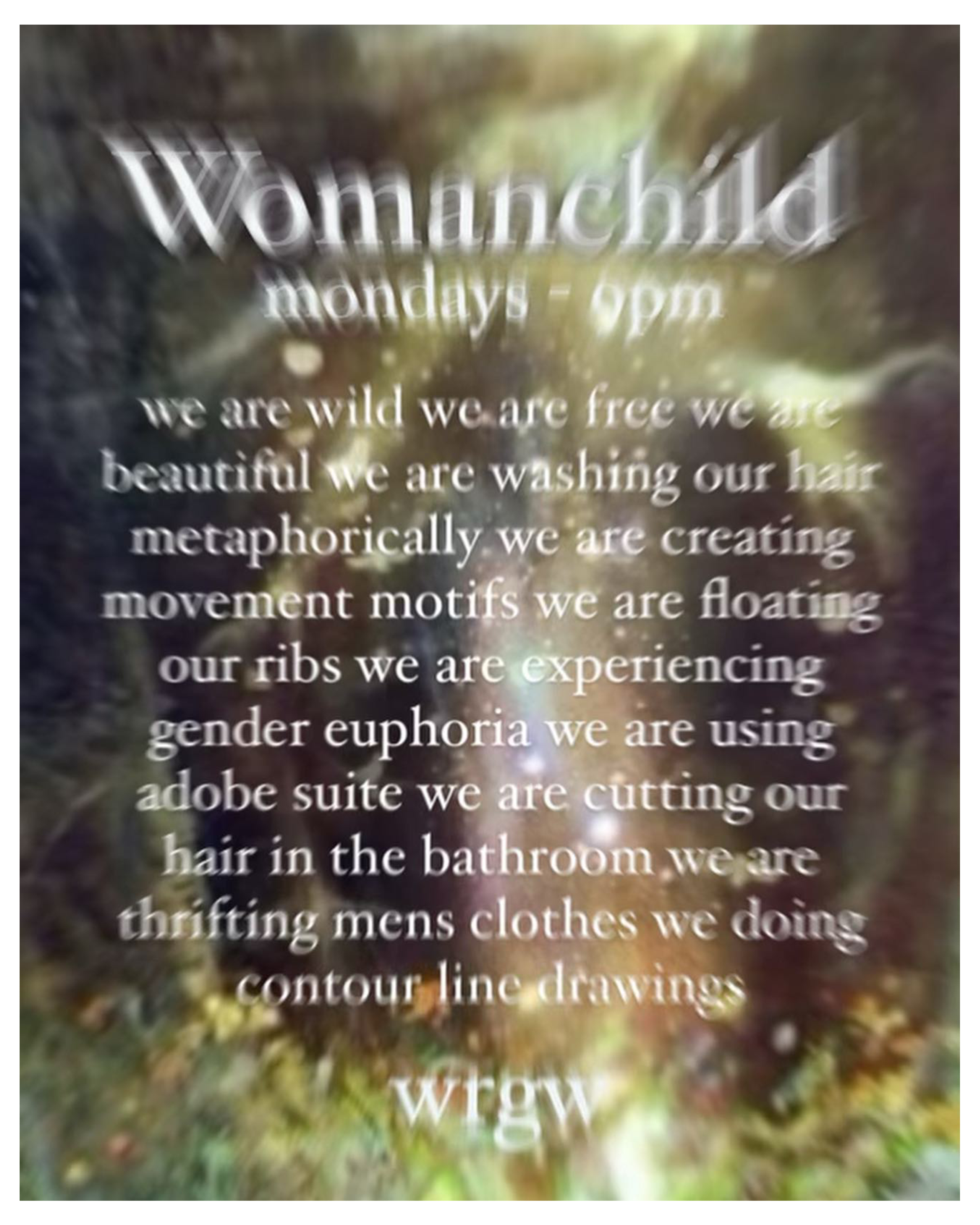 Womanchild is simultaneously a woman and a child while truly being neither, she is her own being. Womanchild grew up online, who enters her 20s expecting a idilic tumblr fantasy only to be met with exhausting corporate repetition and boys who are mean.