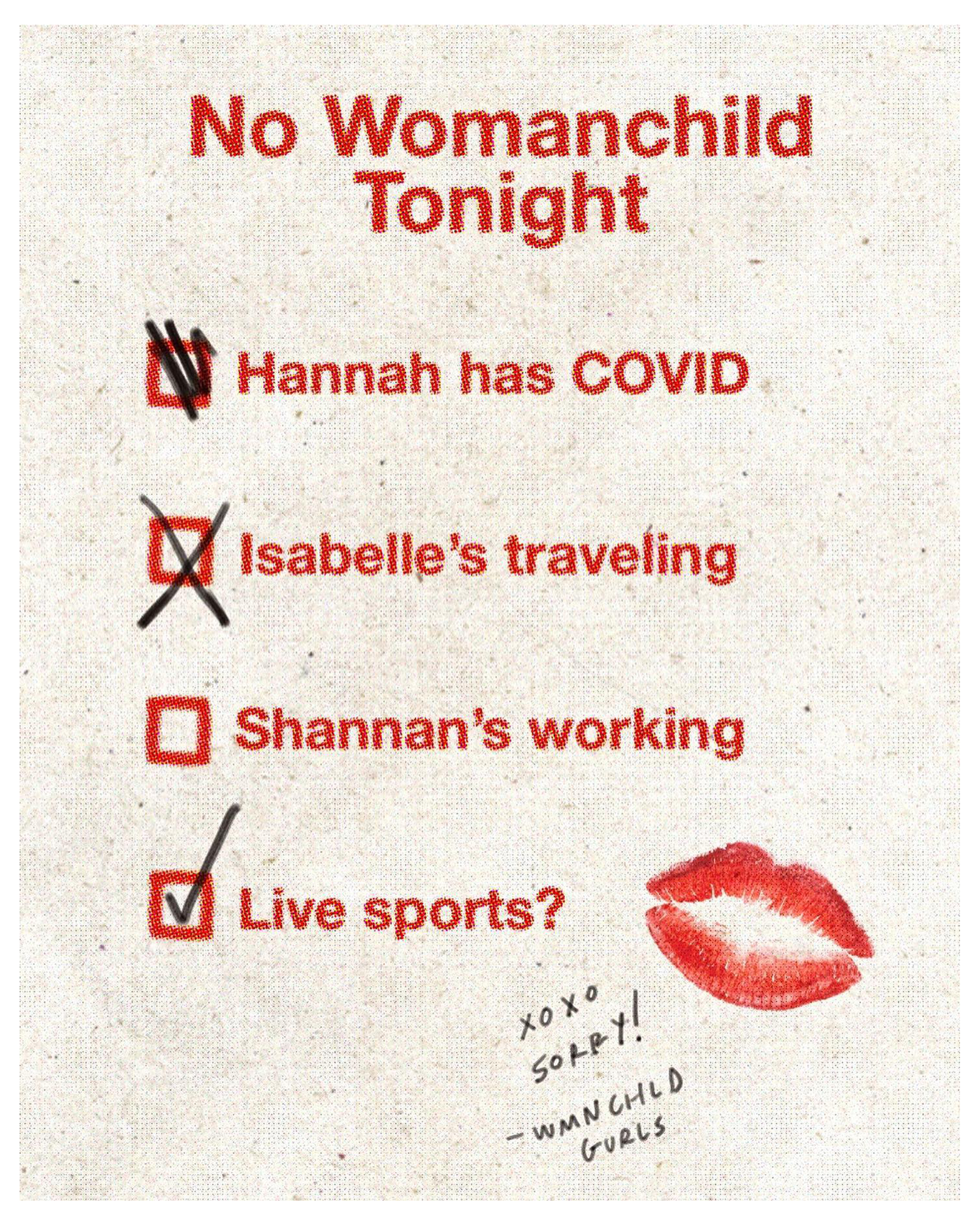 “Her bedroom floor is a vomited pinterest board with dust and six borrowed shirts from a friend and two from men she no longer talks to. Her spotify is a work of art worthy of the moma. She has trouble remembering to call her mom. She is, all at once, shopping for business casual attire, listening to Fiona Apple in the car, pushing she ash from her cigarette that’s fallen onto her thrifted bedside table into a heart shape, and drunk vomiting behind a bush in the park next to her middle school, and making pasta for her beloved friends.” -Hannah Krantz, 1/3 of Womanchild